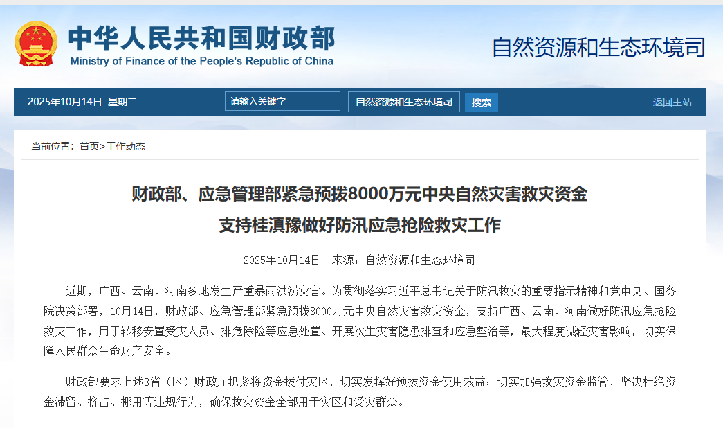 近期,广西、云南、河南多地发生严重暴雨洪涝灾害。为贯彻落实习近平总书记关于防汛救灾的重要指示精神和党中央、国务院决策部署,10月14日,财政部、应急管理部紧急预拨8000万元中央自然灾害救灾资金,支持广西、云南、河南做好防汛应急抢险救灾工作,用于转移安置受灾人员、排危除险等应急处置、开展次生灾害隐患排查和应急整治等,最大程度减轻灾害影响,切实保障人民群众生命财产安全。
