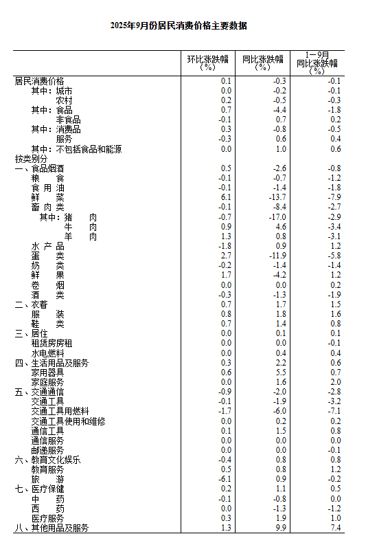 国家统计局:9月份居民消费价格同比下降0.3% 环比上涨0.1%