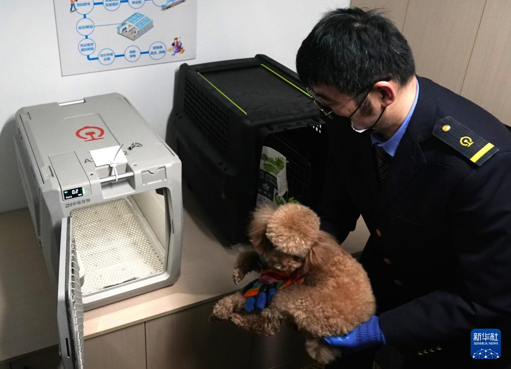 4月10日,在北京南站,工作人员将宠物狗放入高铁专用宠物运输箱。新华社记者 张晨霖 摄