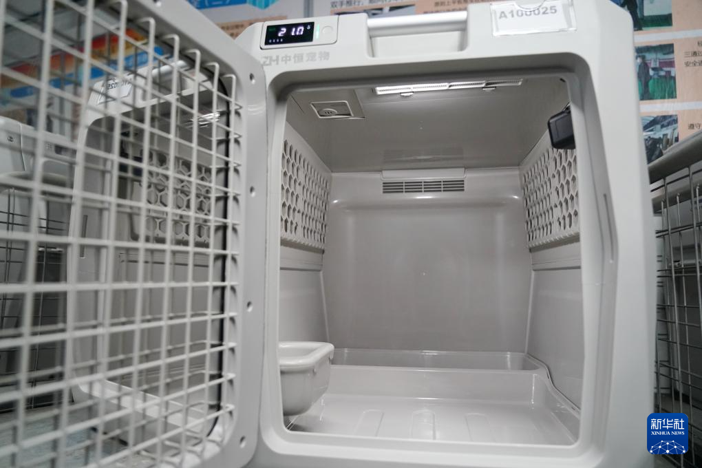 这是4月10日拍摄的高铁专用宠物运输箱,箱子自带空气循环系统、含氧量和温湿度监测及降噪、除味等功能。新华社记者 张晨霖 摄