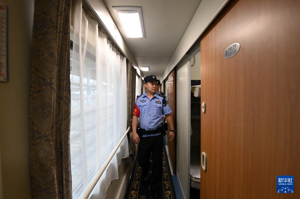 5月25日,南宁铁路公安局南宁公安处乘警支队民警王荣鑫(前)和同事在即将由南宁开往河内(嘉林)的列车上执勤。新华社记者 陆波岸 摄