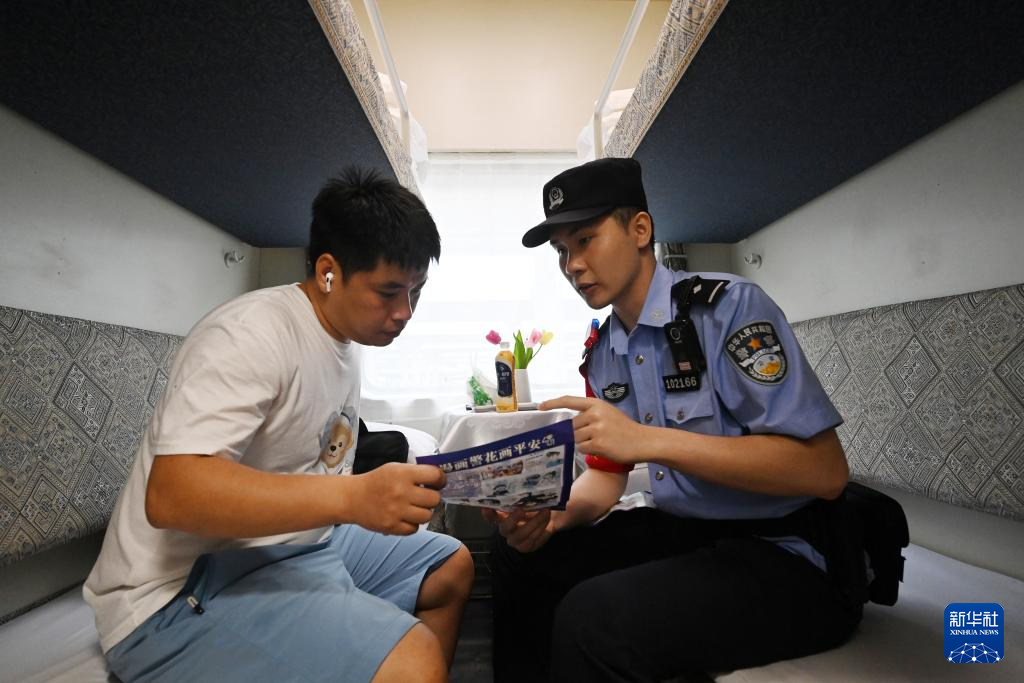 5月25日,南宁铁路公安局南宁公安处乘警支队民警何健林(右)在即将由南宁开往河内(嘉林)的列车上向旅客宣传出行安全。新华社记者 陆波岸 摄