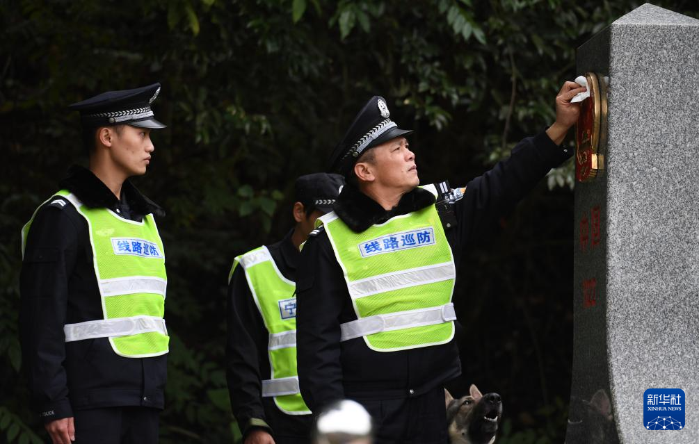 南宁铁路公安局南宁公安处民警陆日峰(右)和同事在中越边境铁路沿线巡逻间隙擦拭界碑(2018年12月31日摄)。新华社记者 陆波岸 摄