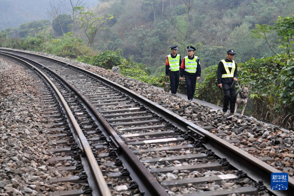 南宁铁路公安局南宁公安处民警陆日峰(中)和同事在中越边境铁路沿线巡逻(2020年1月21日摄)。新华社记者 陆波岸 摄