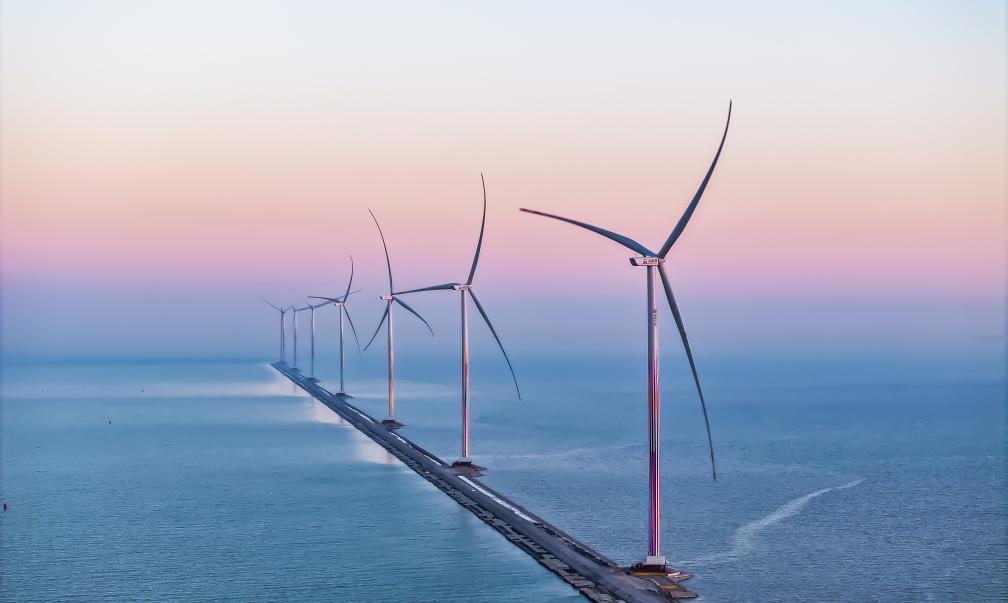 海岸边,24台风力发电机在海风吹动下缓缓转动,为港口输送着绿色电力。