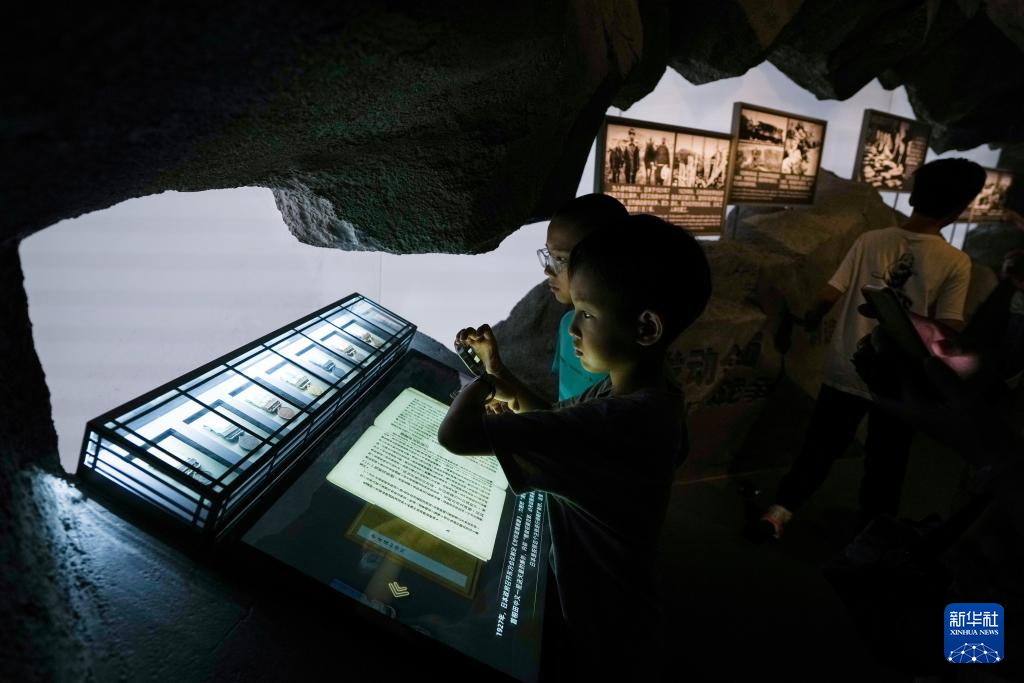 几名小朋友在中国人民抗日战争纪念馆《为了民族解放与世界和平》主题展览参观(7月8日摄)。新华社记者 鞠焕宗 摄