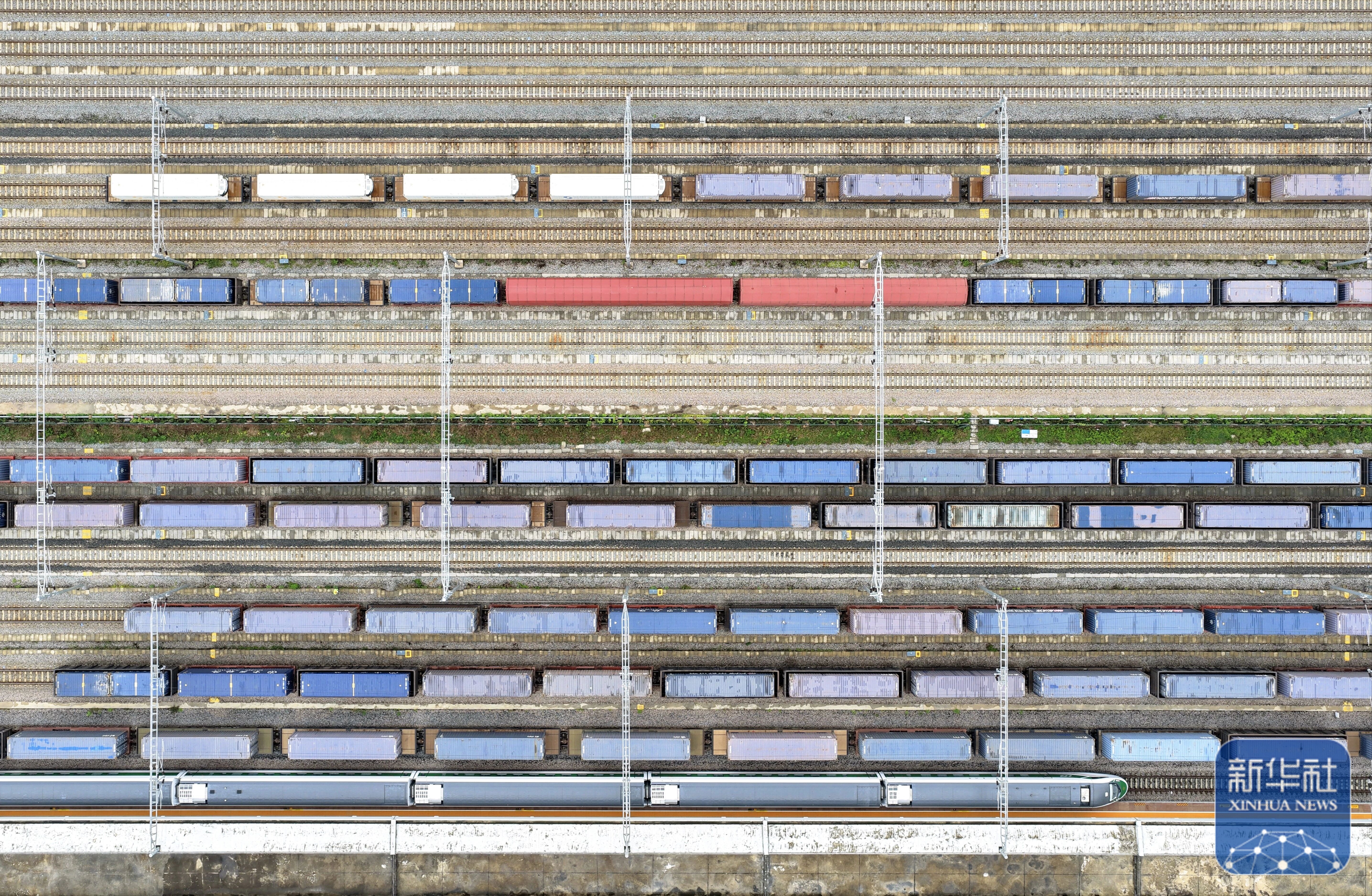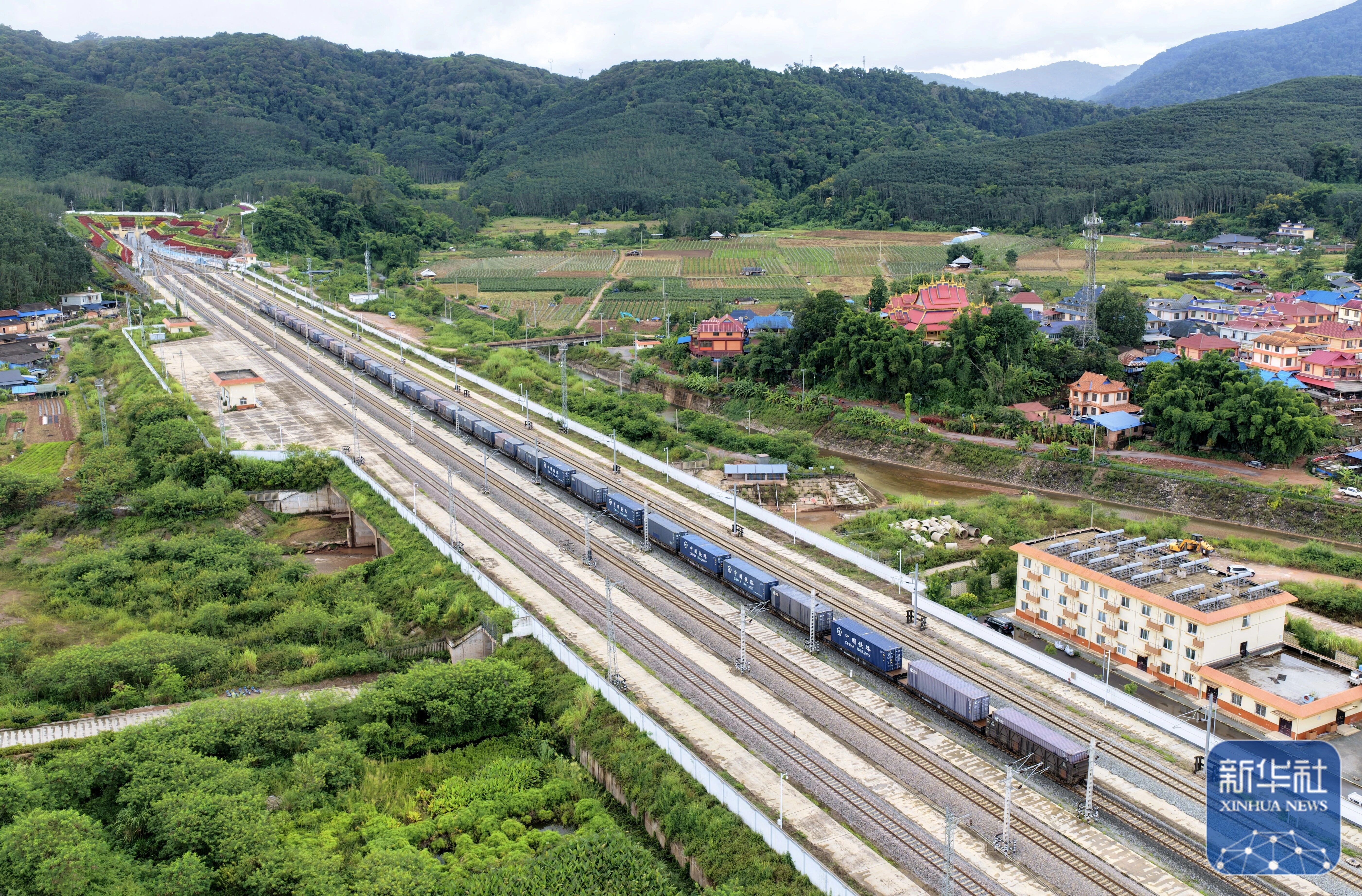 ↑ 9月21日,中老铁路上的货运列车在磨憨站通过(无人机照片)。
