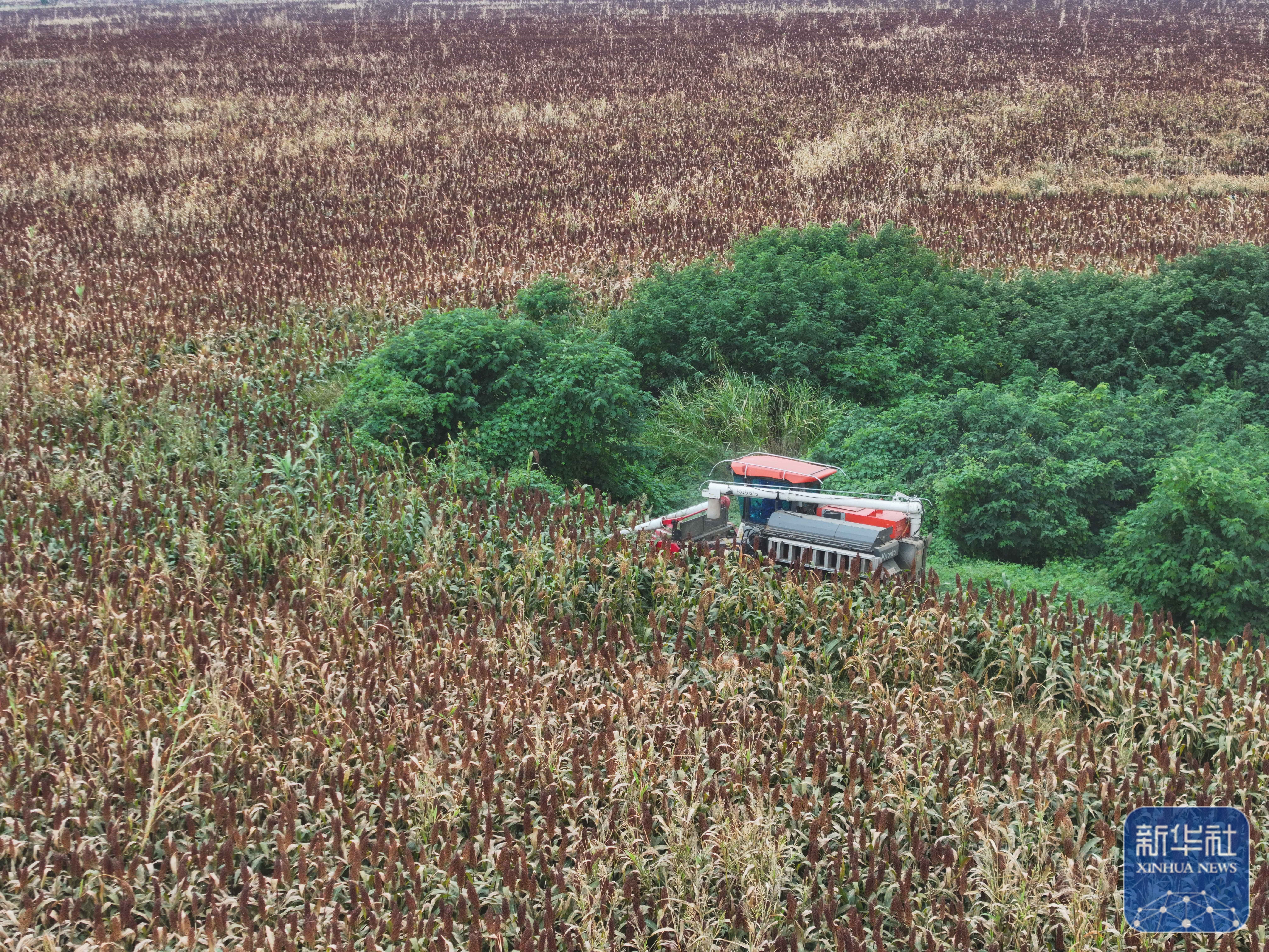 ↑ 9月21日,收割机在地里收割高粱(无人机照片)。新华社记者 季春鹏 摄
