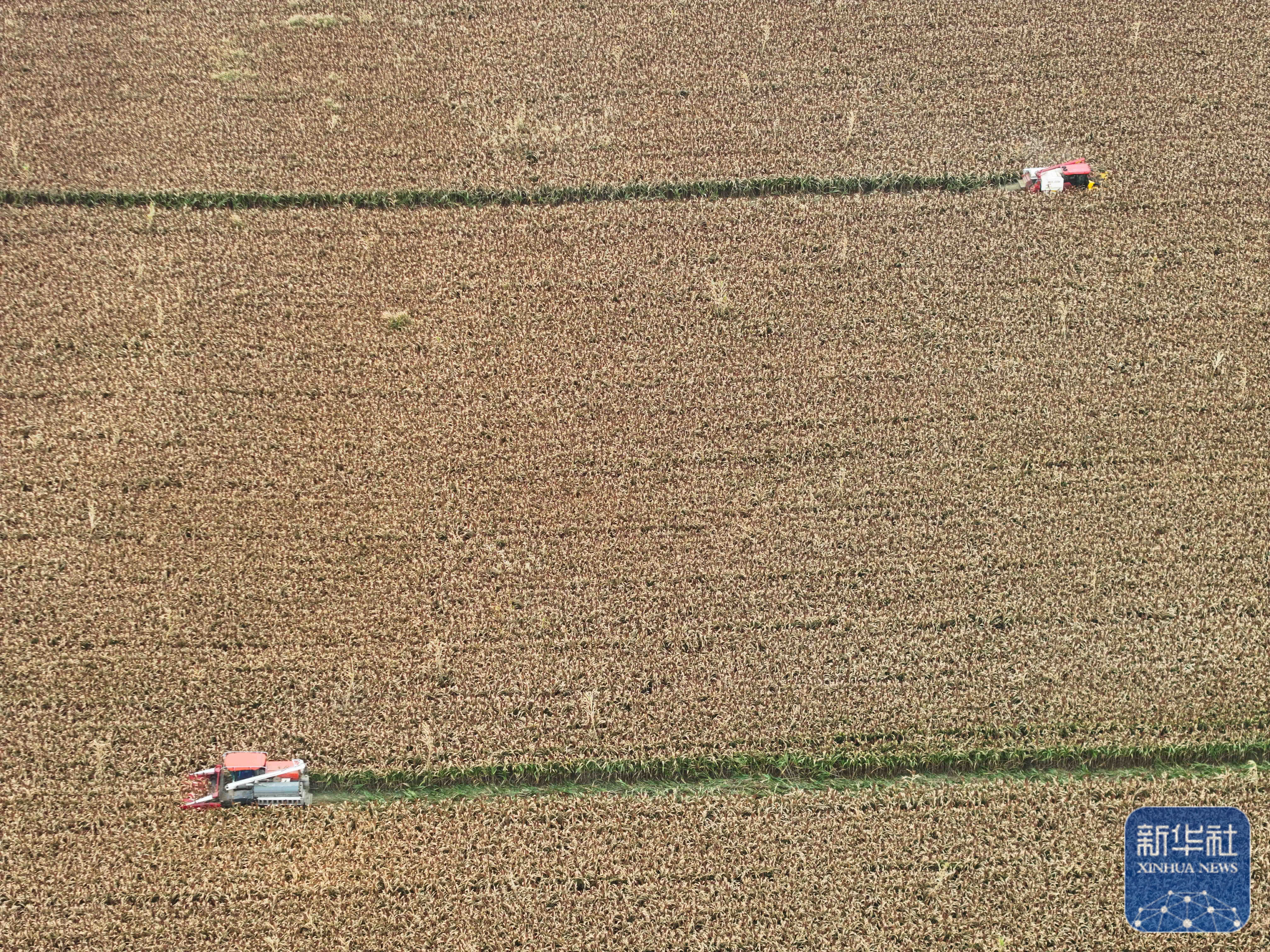 ↑ 9月21日,收割机卸下收割的高粱(无人机照片)。新华社记者 季春鹏 摄