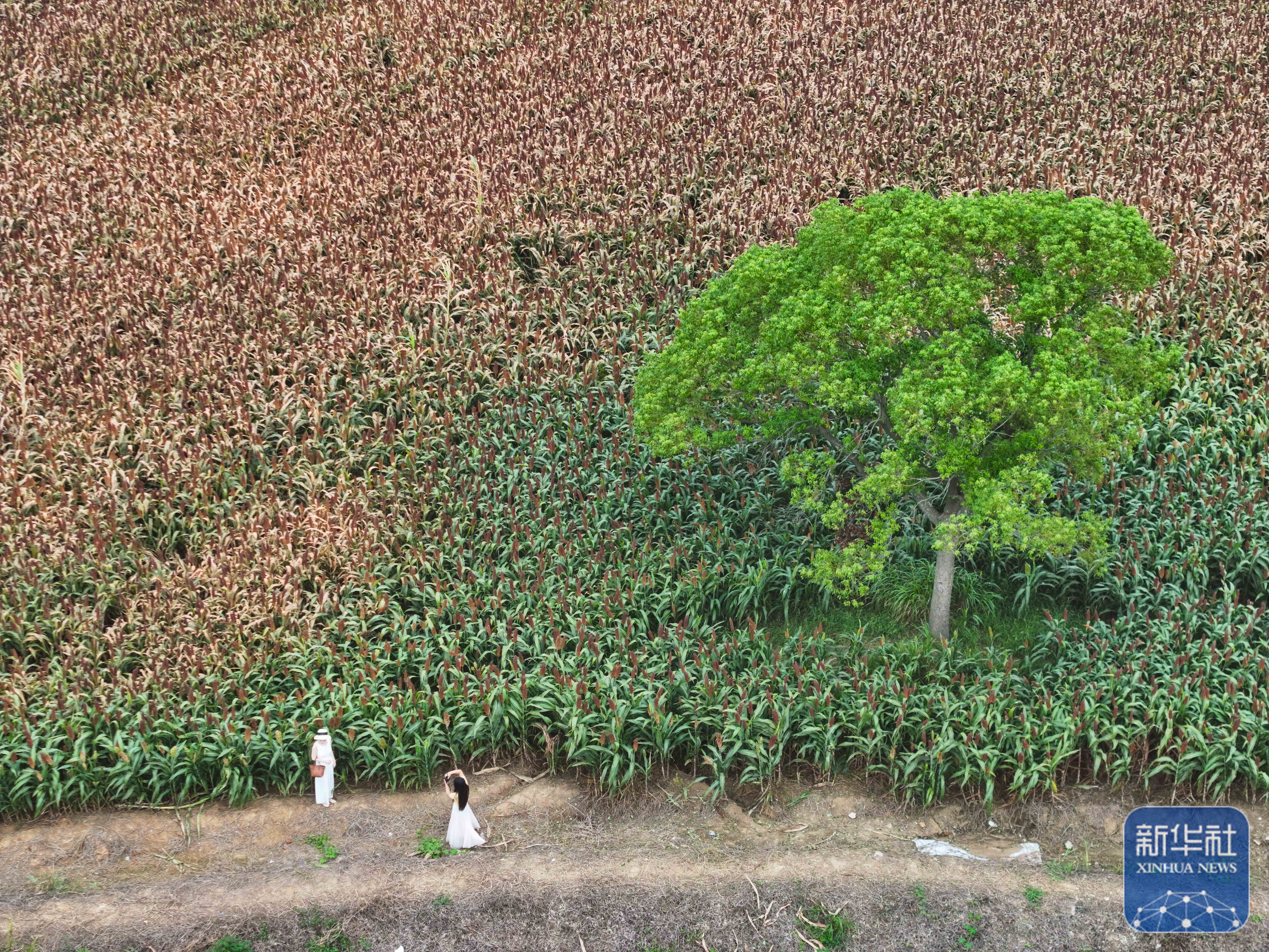 ↑ 9月21日,游人在高粱地打卡拍照(无人机照片)。新华社记者 季春鹏 摄