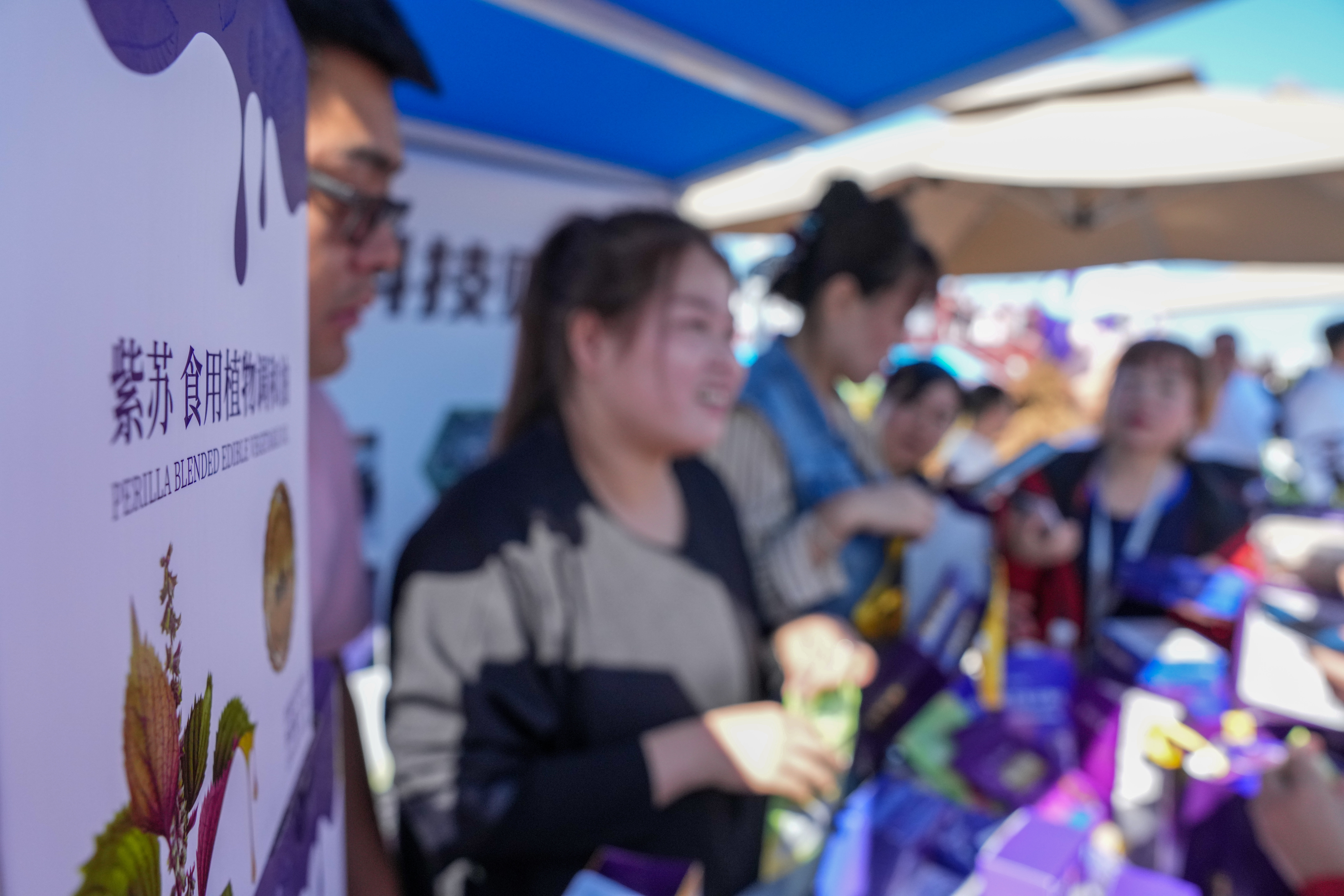 ↑9月23日,黑龙江省佳木斯市桦南县举办庆祝中国农民丰收节活动,一家紫苏制品厂家在活动现场介绍产品。新华社记者 王建威 摄