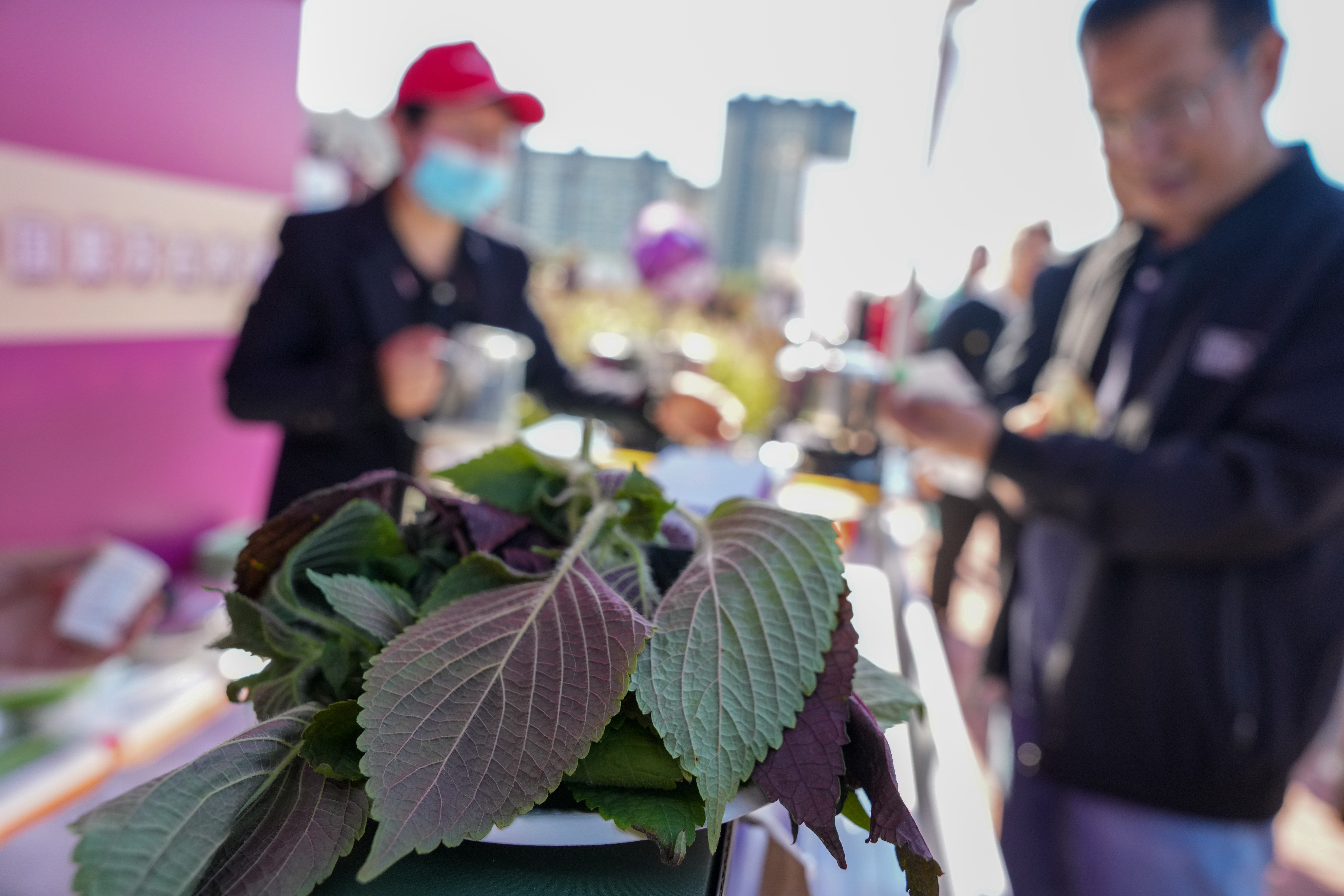 ↑9月23日,黑龙江省佳木斯市桦南县举办庆祝中国农民丰收节活动,参观者在品鉴区品尝紫苏食品。新华社记者 王建威 摄