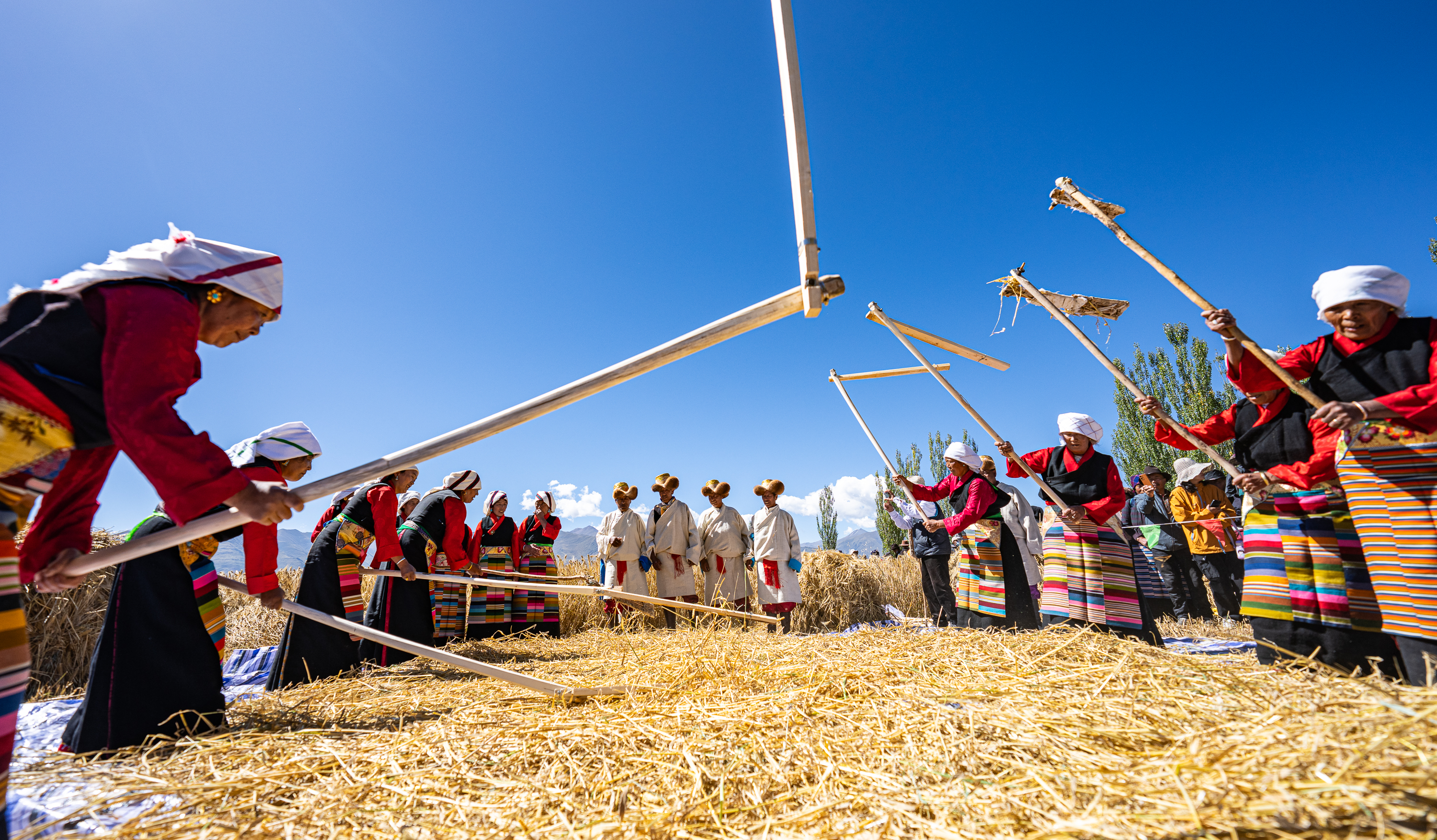 ↑9月23日,在西藏拉萨市林周县强嘎乡典冲村,当地农民用传统方式打场。新华社记者 丁增尼达 摄
