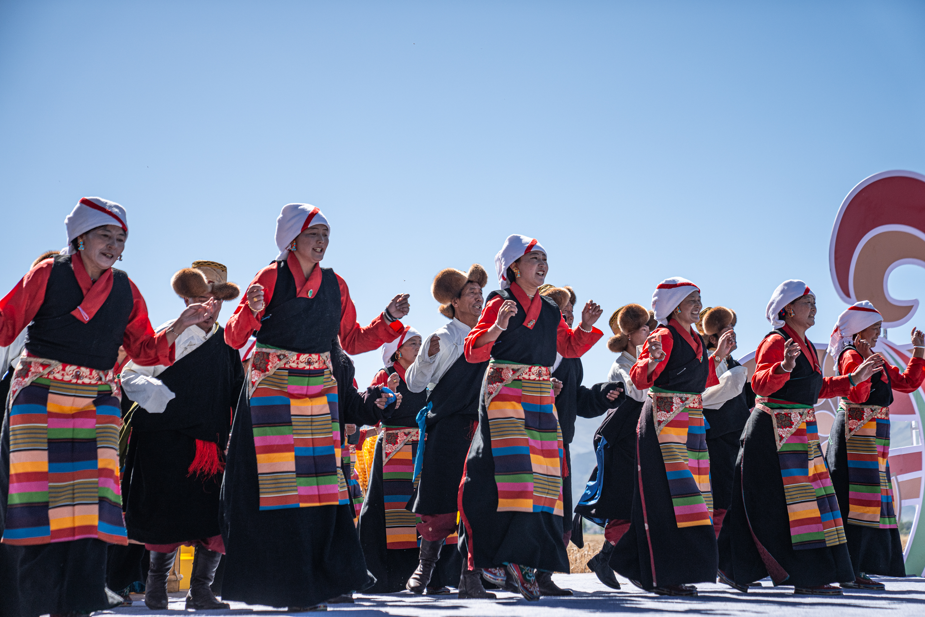 ↑9月23日,在西藏拉萨市林周县强嘎乡典冲村,当地农牧民群众载歌载舞迎丰收。新华社记者 丁增尼达 摄