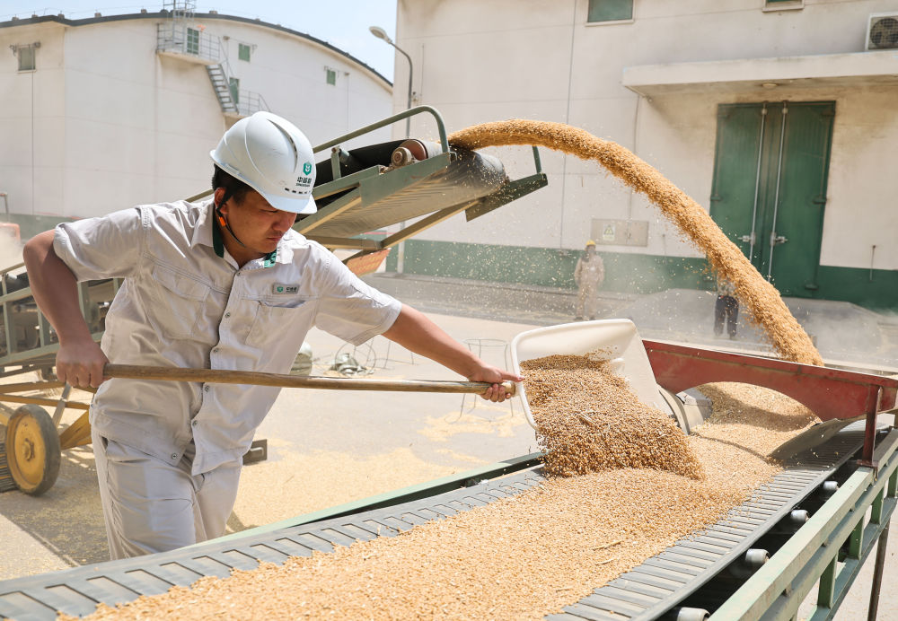 在江苏连云港市连云区的中央储备粮连云港直属库粮食收购作业区,工作人员用传输机传送小麦入库(2025年6月18日摄)。新华社发(王健民摄)