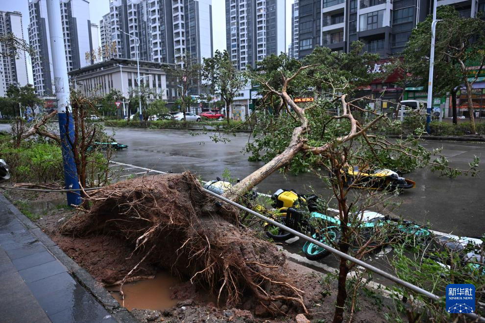 9月24日在广东阳江市江城区横一路拍摄的被风吹倒的大树和电动自行车。新华社记者邓华摄