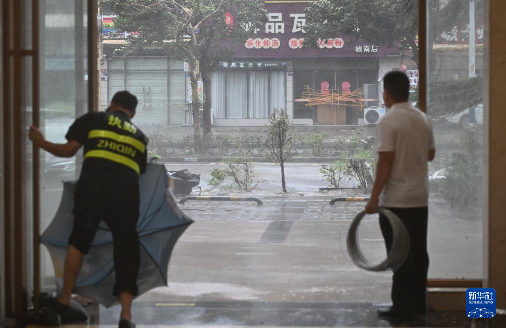 9月24日,广东阳江市江城区横一路一家酒店的工作人员在加固玻璃大门。新华社记者邓华摄
