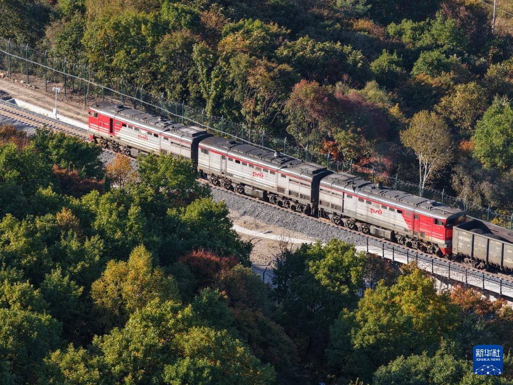 9月27日,满载大宗品类货物的入境列车在滨绥铁路绥芬河至国境线提质改造工程新线路上行驶(无人机照片)。新华社记者 王松 摄