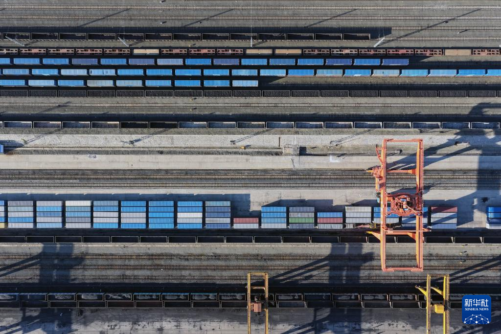 9月27日,满载货物的列车在绥芬河站北场进行换装作业(无人机照片)。新华社记者 王松 摄