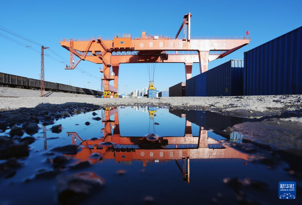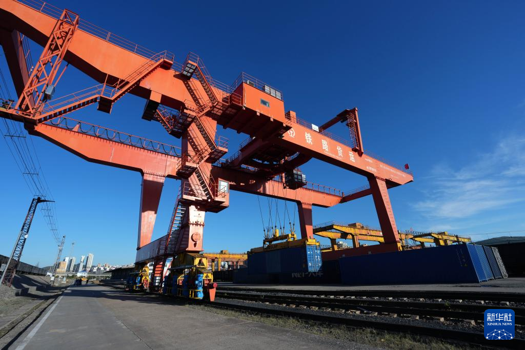 9月27日,在绥芬河站集装箱换装场,龙门吊在对回程中欧班列进行换装作业。新华社记者 王松 摄