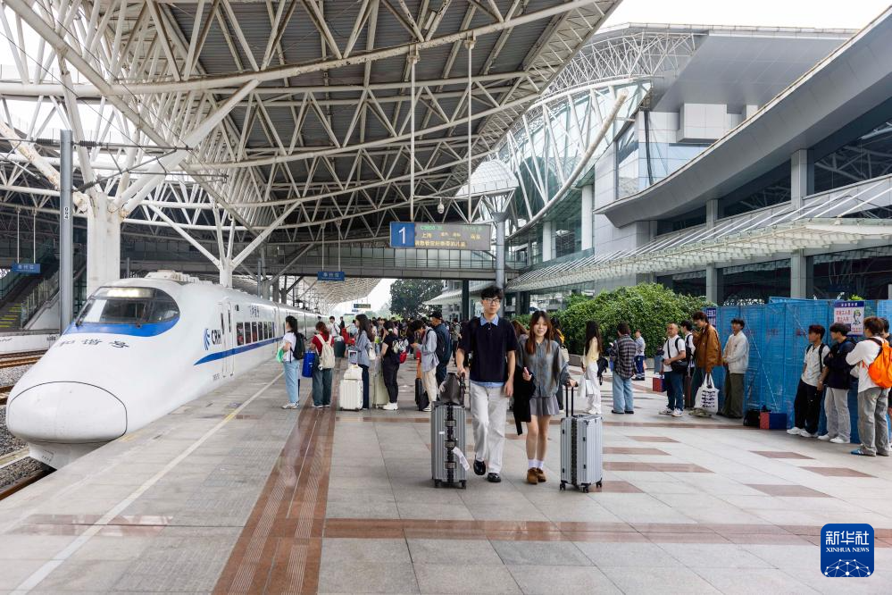 9月29日,旅客在浙江金华站有序乘车。新华社发(胡肖飞 摄)