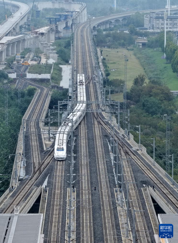 9月29日,一列动车组列车驶出扬州东站(无人机照片)。新华社发(孟德龙摄)