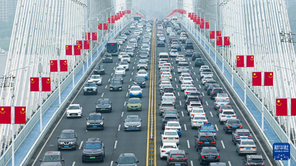 10月1日,车辆行驶在湖北省武汉长江二桥上(无人机照片)。新华社记者 肖艺九 摄
