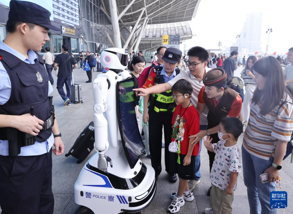 10月1日,在湖北省武汉站,小朋友和机器人互动。新华社发(赵军摄)