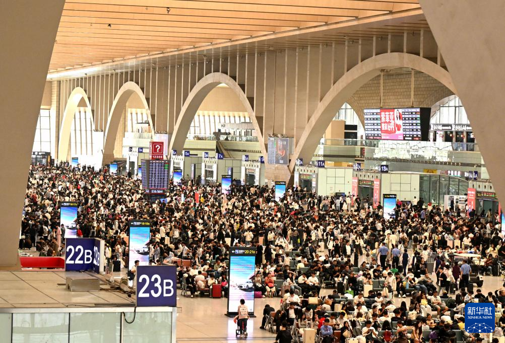 10月1日,旅客在湖北省武汉站东广场进站口准备乘车出行(无人机照片)。新华社发(赵军摄)