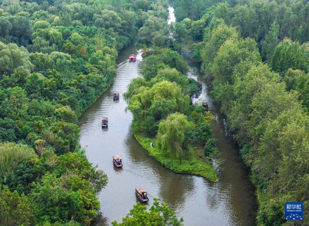 10月1日,游客在江苏省泰州市姜堰区溱湖国家湿地公园乘船游玩(无人机照片)。新华社发(周社根 摄)