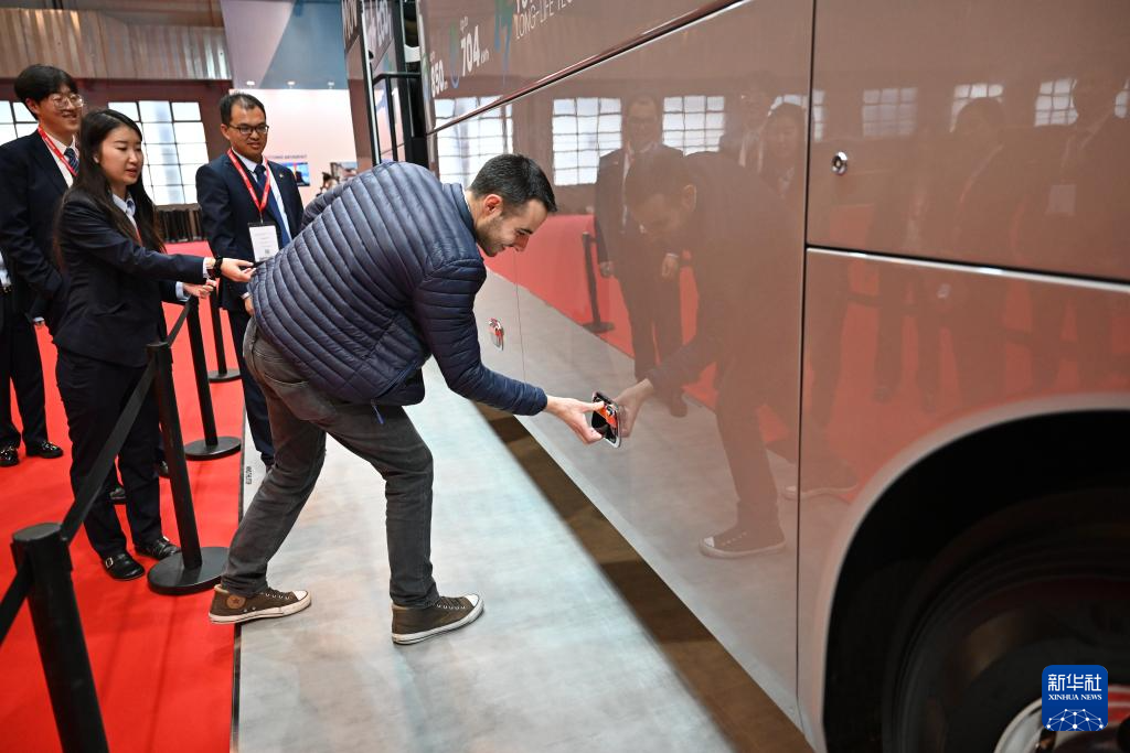 10月4日,在比利时布鲁塞尔举行的世界客车博览会上,一名参观者准备打开宇通客车的行李舱。新华社记者 吕优 摄