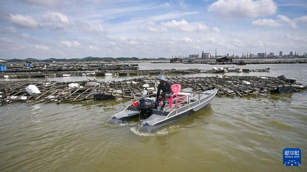 10月7日,钦州市钦南区龙门港镇南村一名村民驾船去修补受损蚝排。新华社记者 张爱林 摄