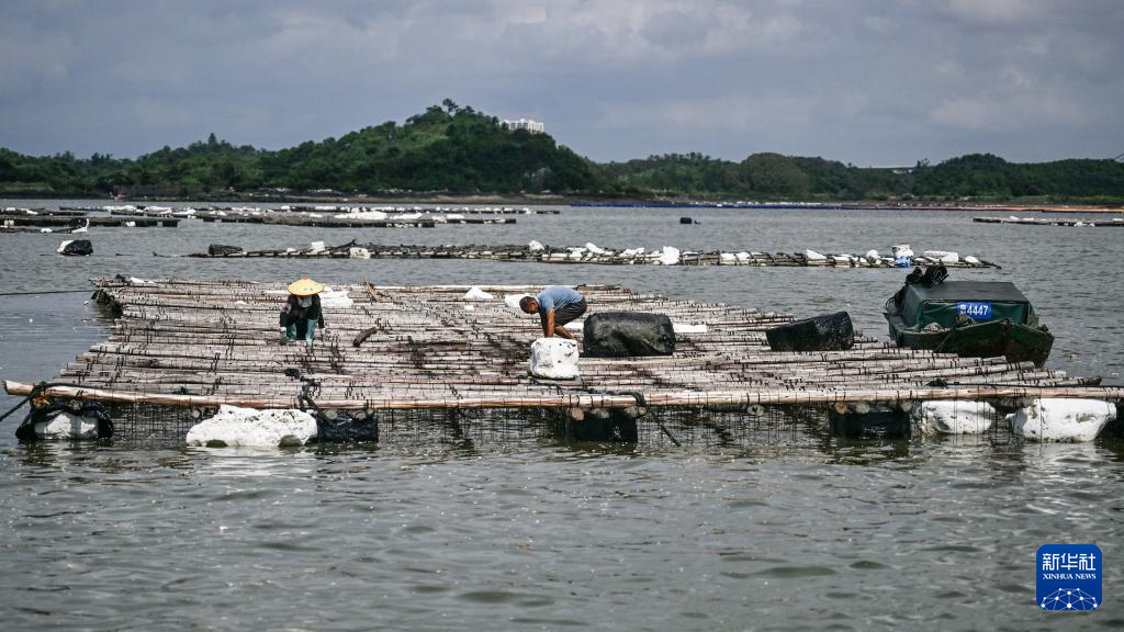 10月7日,钦州市钦南区龙门港镇南村村民在修补受损蚝排。新华社记者 张爱林 摄