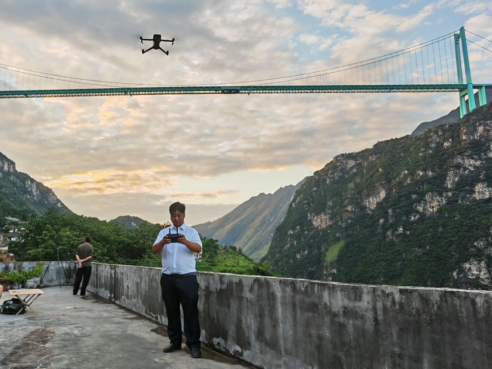 当夕阳的余晖洒向花江村,一栋民房的天台聚集了十多位摄影师,他们手中相机、无人机按键的声音此起彼伏,只为捕捉高桥与晚霞同框的美妙瞬间。
