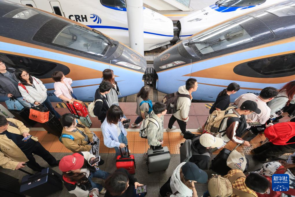 10月8日,旅客在江苏无锡火车站站台乘车。新华社发(还月亮摄)