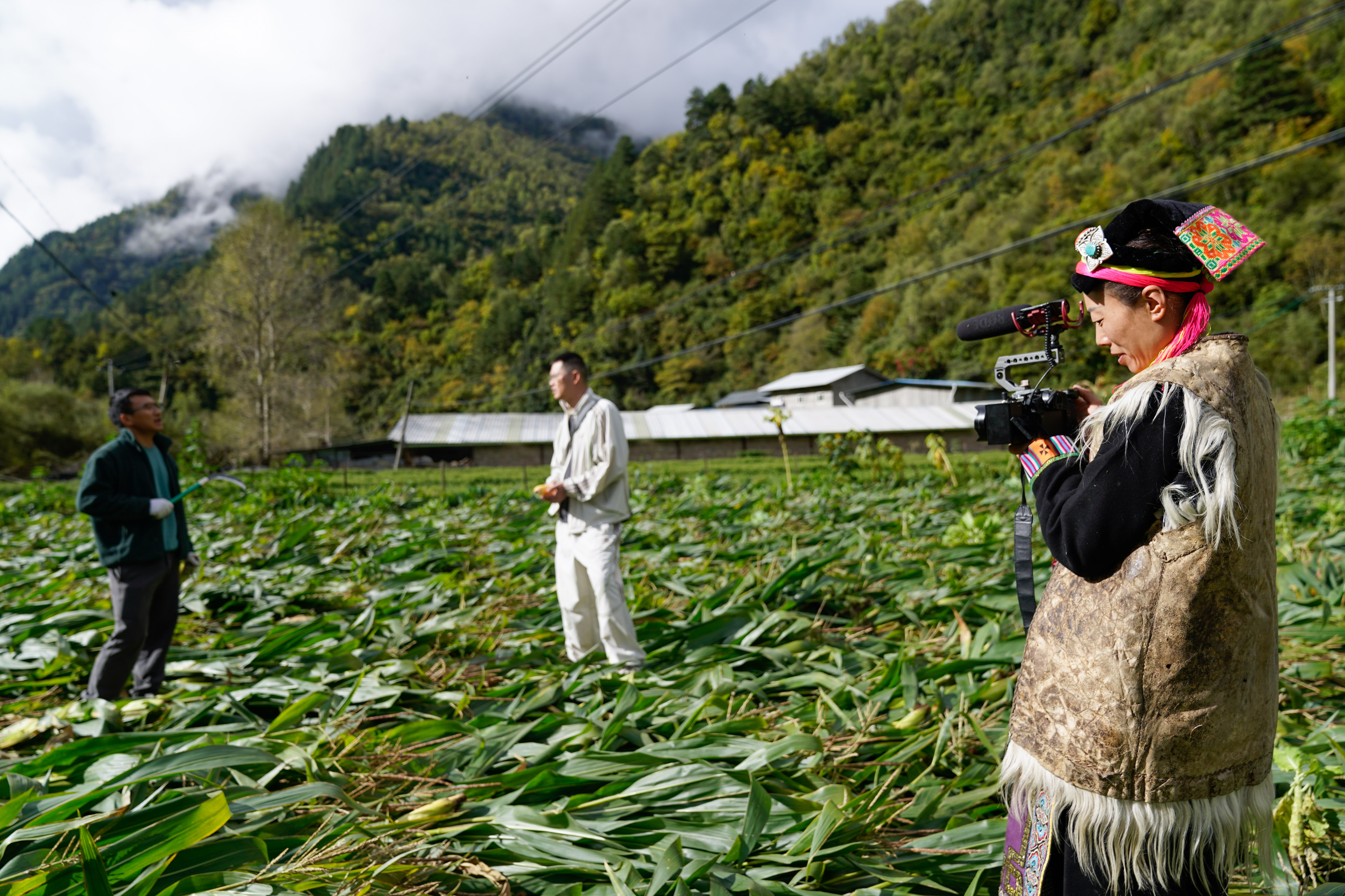↑10月8日,能卡曼(右)在四川雅安宝兴县硗碛藏族乡夹金山村的田地里拍摄视频素材。新华社记者 胥冰洁 摄