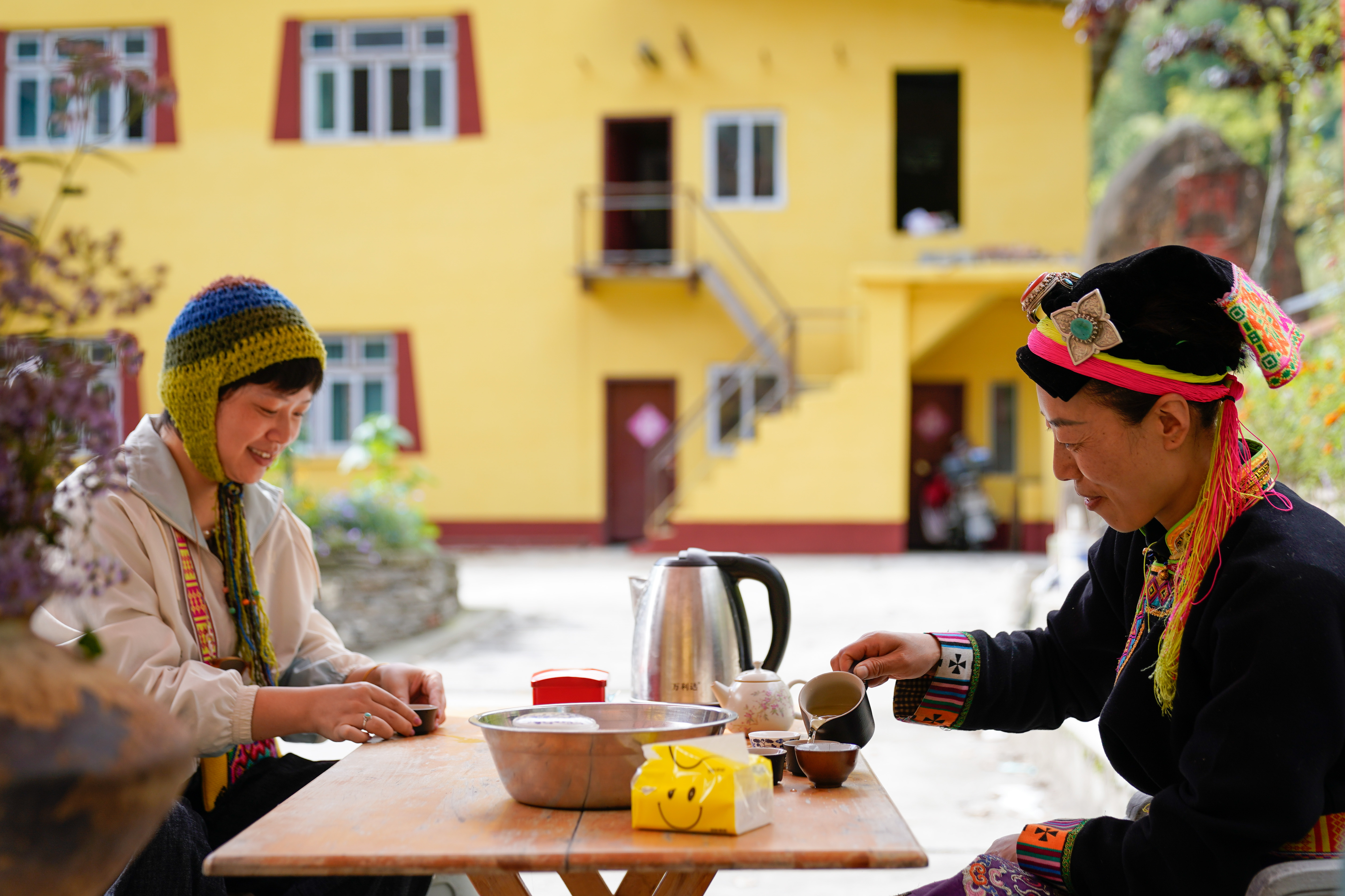 ↑10月8日,能卡曼(右)与游客在藏家乐里喝茶休息。新华社记者 胥冰洁 摄