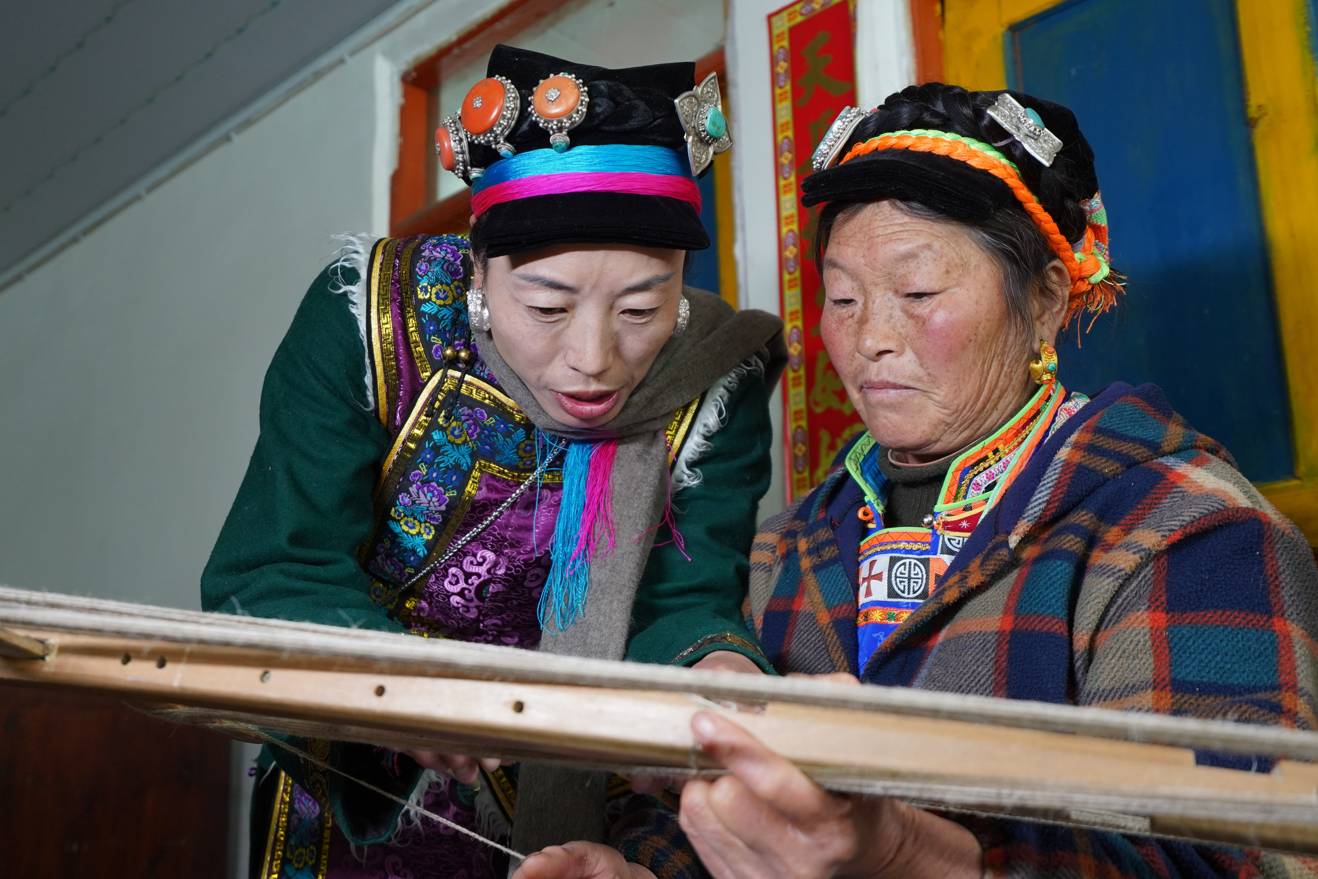 ↑10月7日,能卡曼(左)在工作室里为游客介绍硗碛花腰带编织技艺。新华社记者 胥冰洁 摄