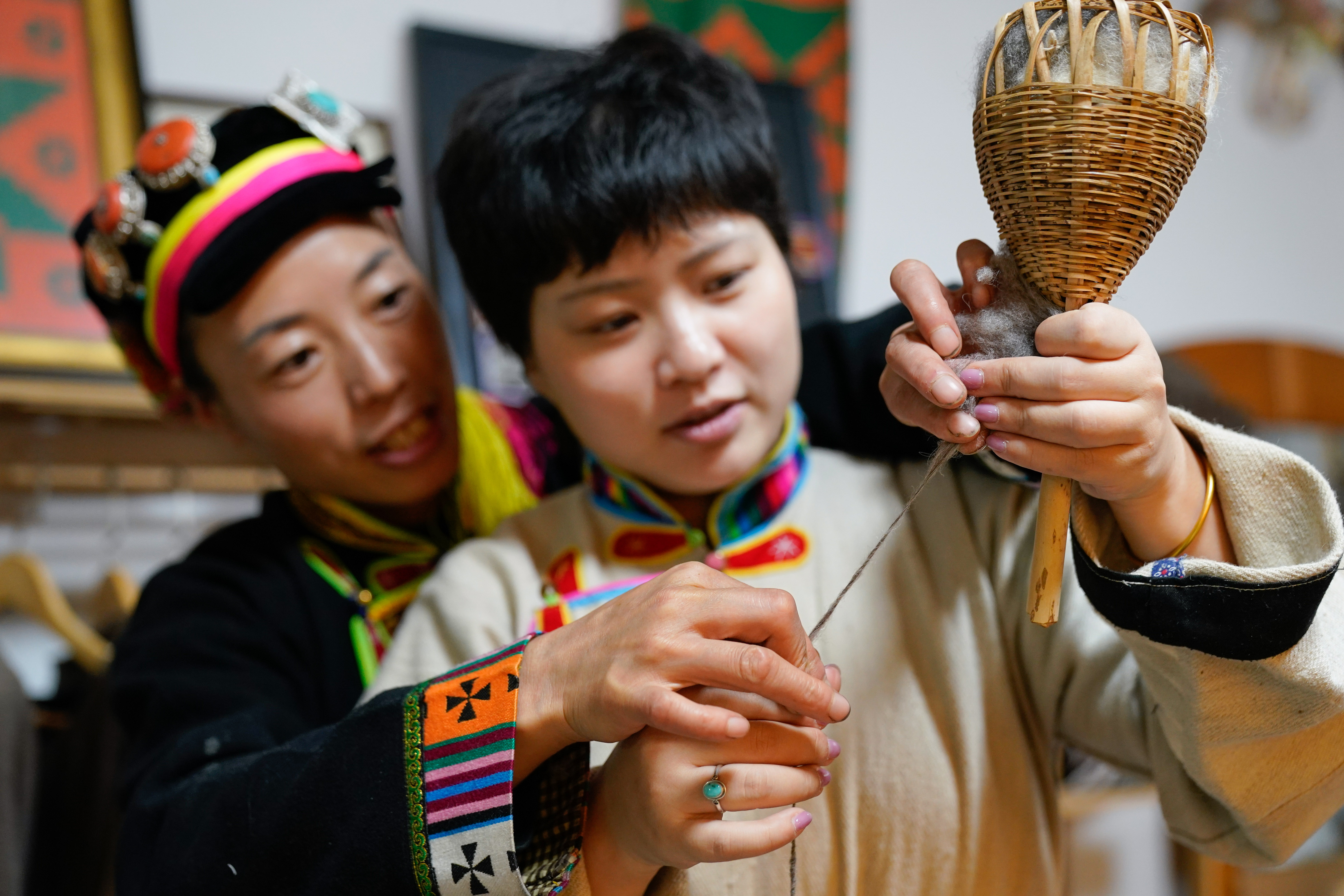 ↑10月7日,能卡曼(左)在工作室带领游客体验牦牛毛纺织技艺流程中的捻线。新华社记者 胥冰洁 摄