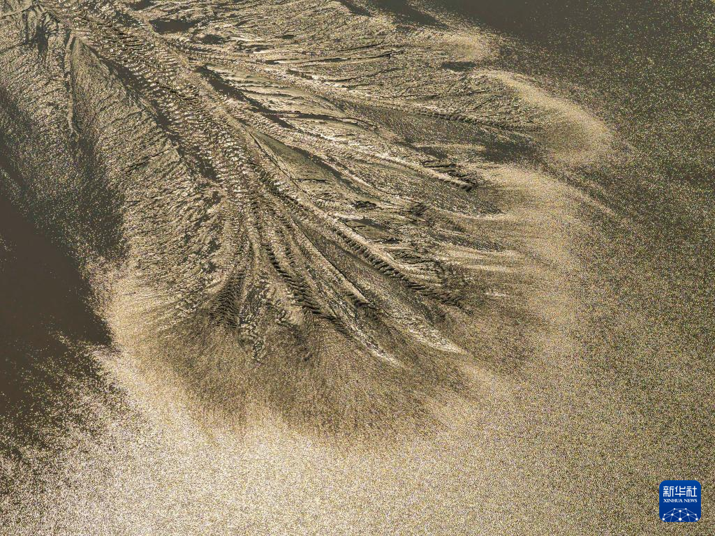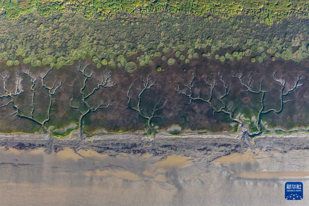 这是10月11日在浙江嘉兴海宁拍摄的钱塘江退潮后的“潮汐树”(无人机照片)。新华社记者 徐昱 摄
