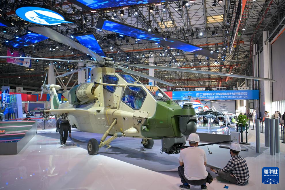 10月14日,工作人员在天津直博会直升机馆内布展。新华社记者 孙凡越 摄