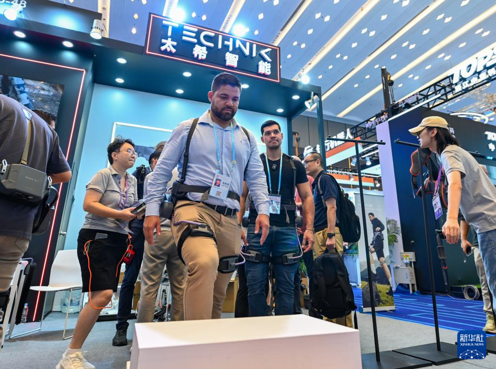 10月15日,境外采购商在第138届广交会服务机器人专区体验外骨骼穿戴设备。新华社记者 邓华 摄