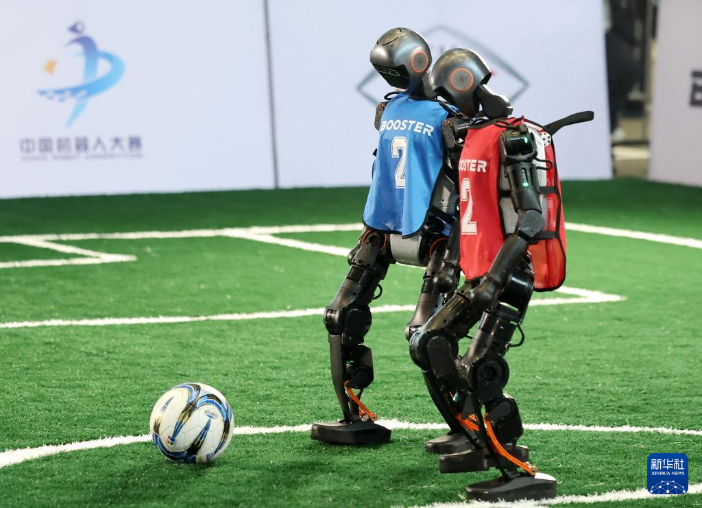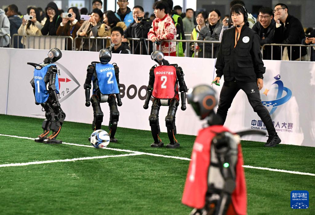 10月17日,机器人在河北省石家庄国际会展中心进行足球比赛。新华社发(陈其保摄)