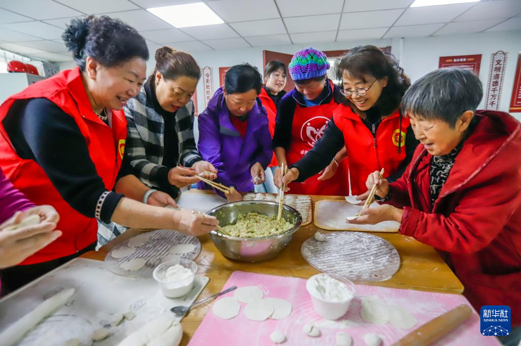 10月29日,志愿者在河北省承德市高新技术产业开发区滨河社区和老人一起包饺子。 新华社发(刘满仓摄)