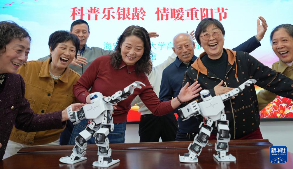 10月29日,江苏省海安市老年大学高新区分校,老年学员跟着机器人起舞。 新华社发(周强摄)