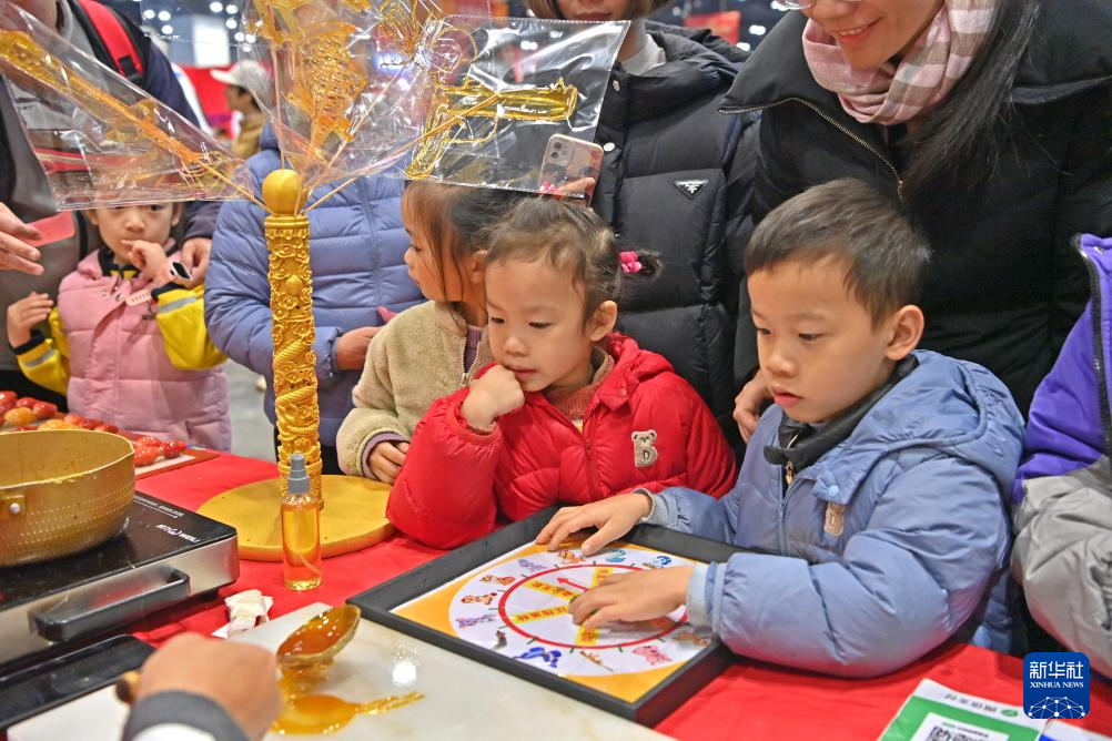 1月24日,在广西南宁国际会展中心,小朋友在年货大集上观看糖画。新华社记者 周华 摄