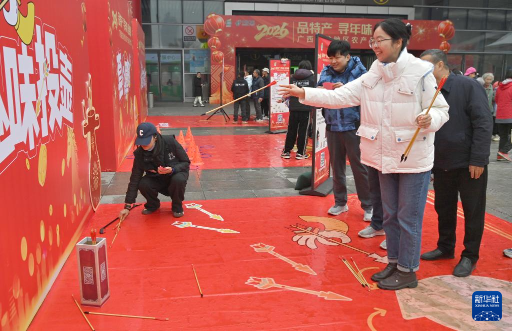 1月24日,在广西南宁国际会展中心,市民在年货大集现场体验投壶。新华社记者 周华 摄