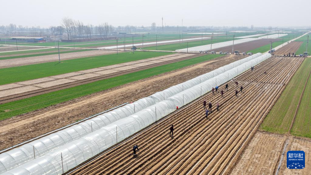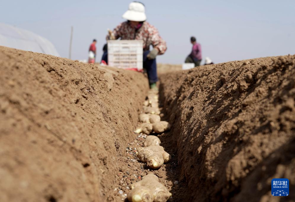 3月25日,河北省石家庄市行唐县南桥镇农民在田间种植生姜。新华社记者 杨世尧 摄