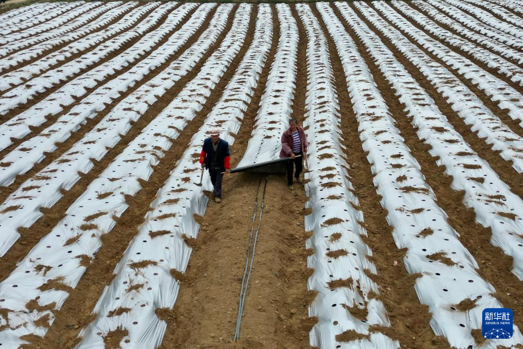 3月25日,贵州省毕节市赫章县兴发苗族彝族回族乡农民在田间进行覆膜作业(无人机照片)。新华社发(江子钰摄)