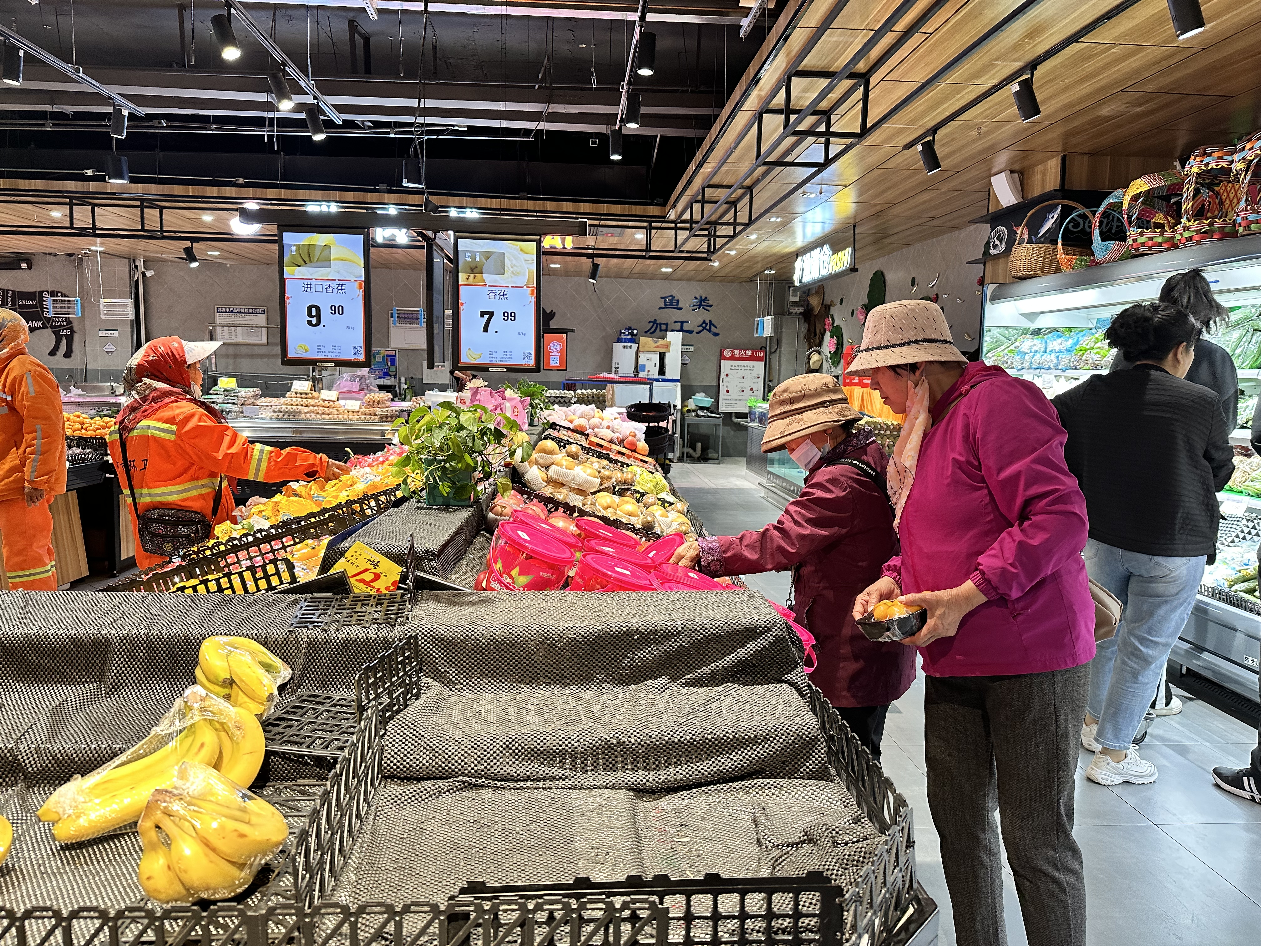 5月1日,在阿勒泰市雪域超市,各种新鲜的水果、蔬菜整齐地摆放在货架上,肉蛋奶、米面油等生活必需品种类齐全、货品新鲜,不时有市民推车选购,超市工作人员根据销售情况实时补货。